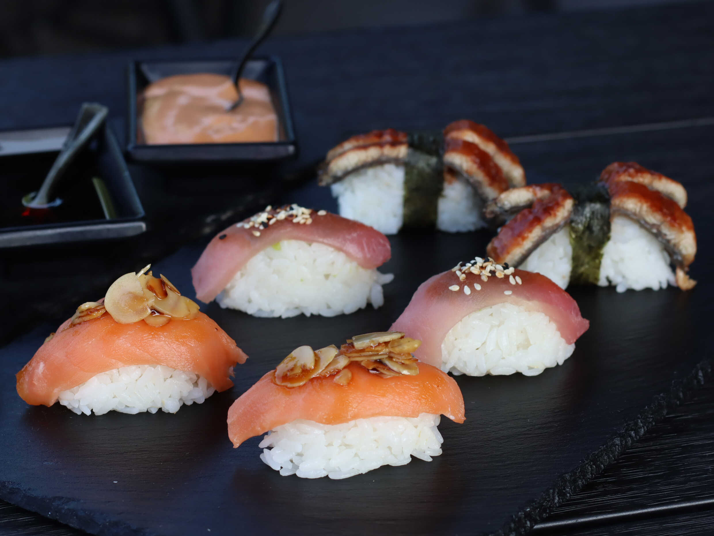 Nigiri de salmón con piña, almendras, tostadas y salsa de anguila, orden de 2 piezas