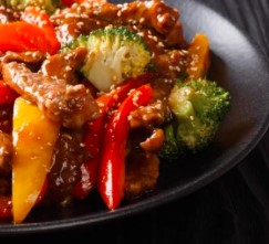 Pollo tempura salteado en una salsa cítrica agridulce.