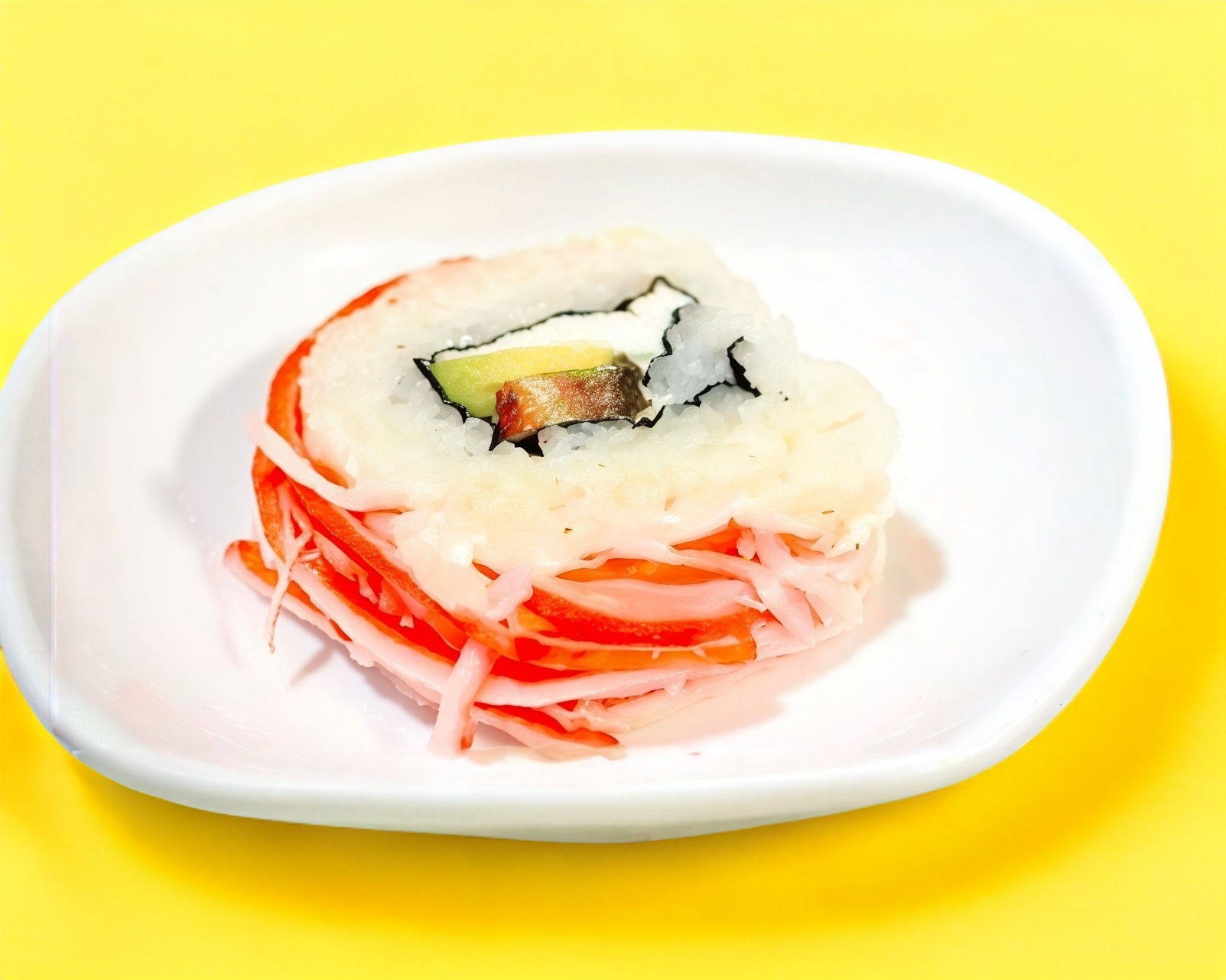 Anguila, aguacate y queso crema por dentro y surimi por fuera.
