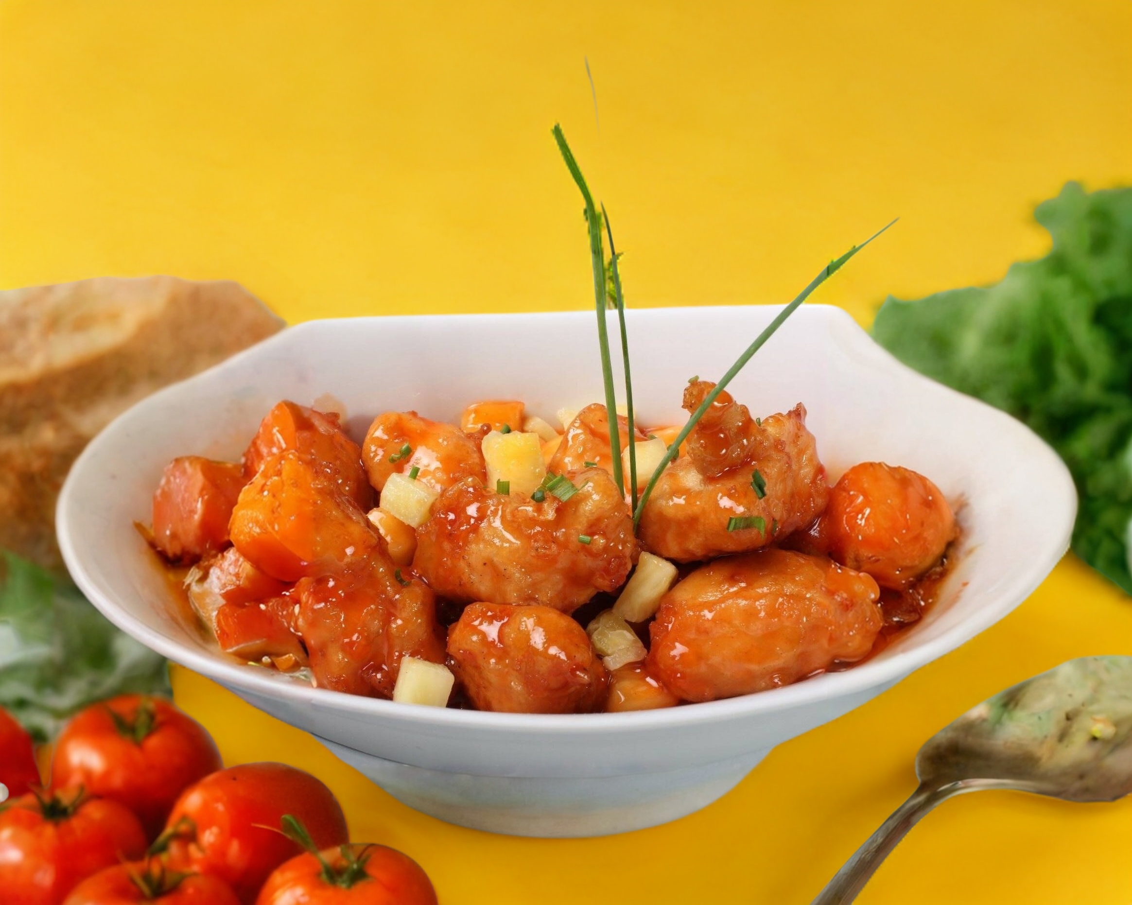 Pollo tempura salteado en una salsa agridulce con trocitos de piña.