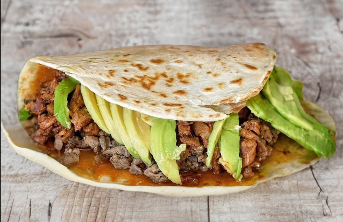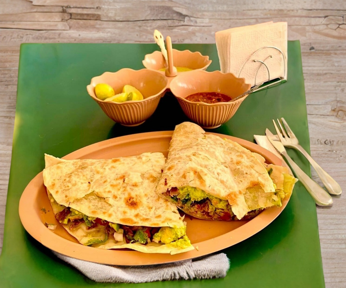Quesadilla en tortilla de harina de 30 cm con carne asada de res, pico de gallo, aguacate, limones y salsas.