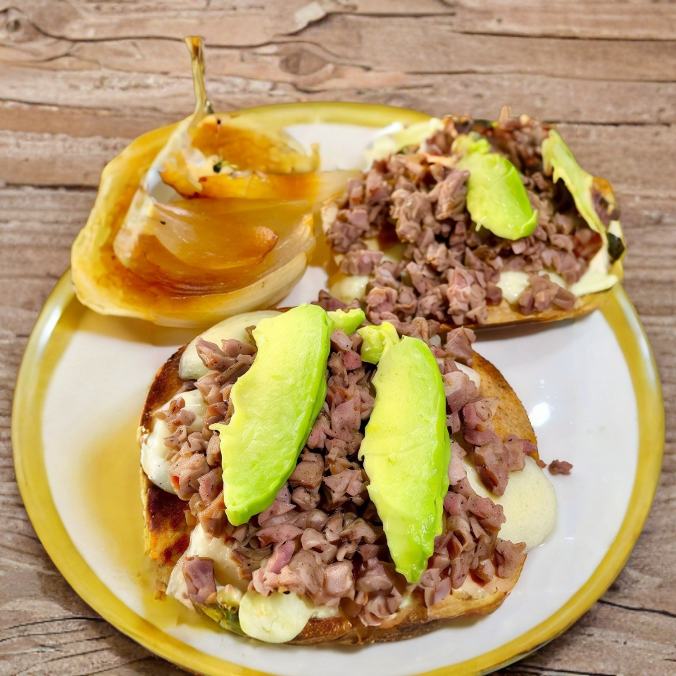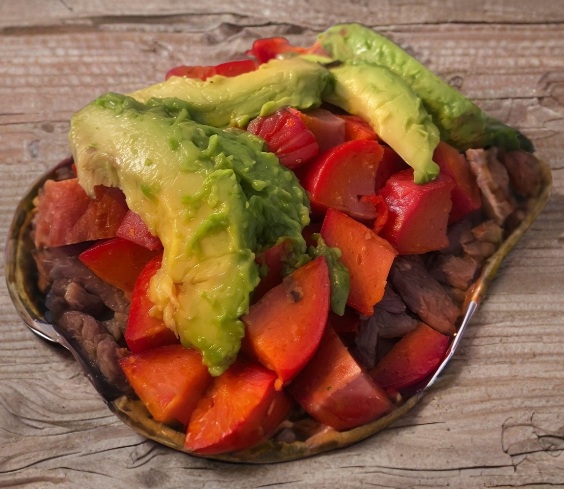 Tostada con queso, carne asada de res, aguacate, cebolla asada, limón y salsas.