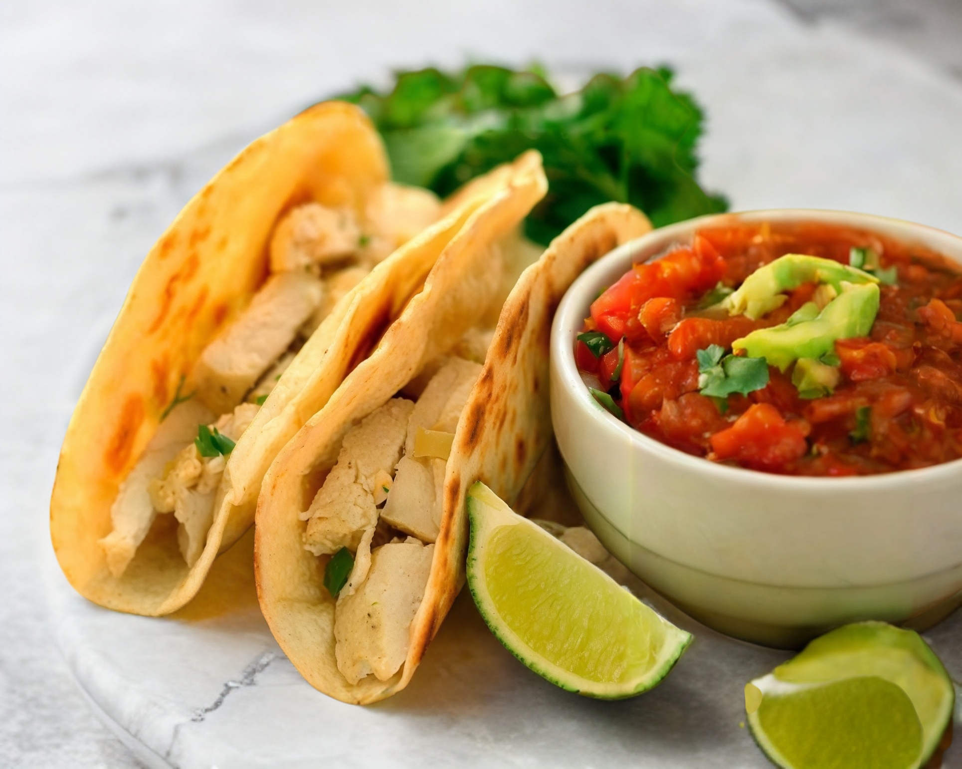 Taco de fajita de pollo, con cebolla asada, limón y salsas.