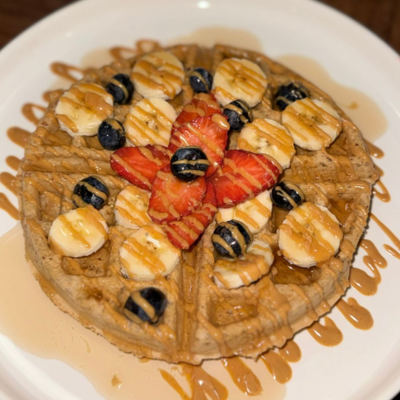 Delicioso waffle saludable elaborado con harina de avena, claras de huevo, canela, stevia, un toque de vainilla, 2 frutas frescas a elegir, crema de cacahuate y maple sugar free