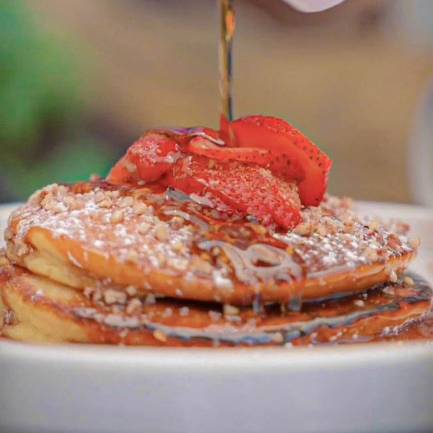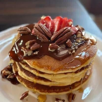 2pz de hot cakes con nuez picada y fresas naturales.