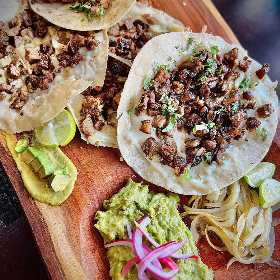 Quesadilla de maiz con opción de 1 guiso: bisteck, picadillo, deshebrada, chicharrón rojo, chicharrón verde, charroón regio (5 extra), papas con chorizo, papas con huevo, huevo verde, huevo rojo, huevo con chorizo, huevo con machacado, huevos con chicharrón, salsa verde, salsa de chorizo, nopales, barbacoa, asado o rajas con crema.