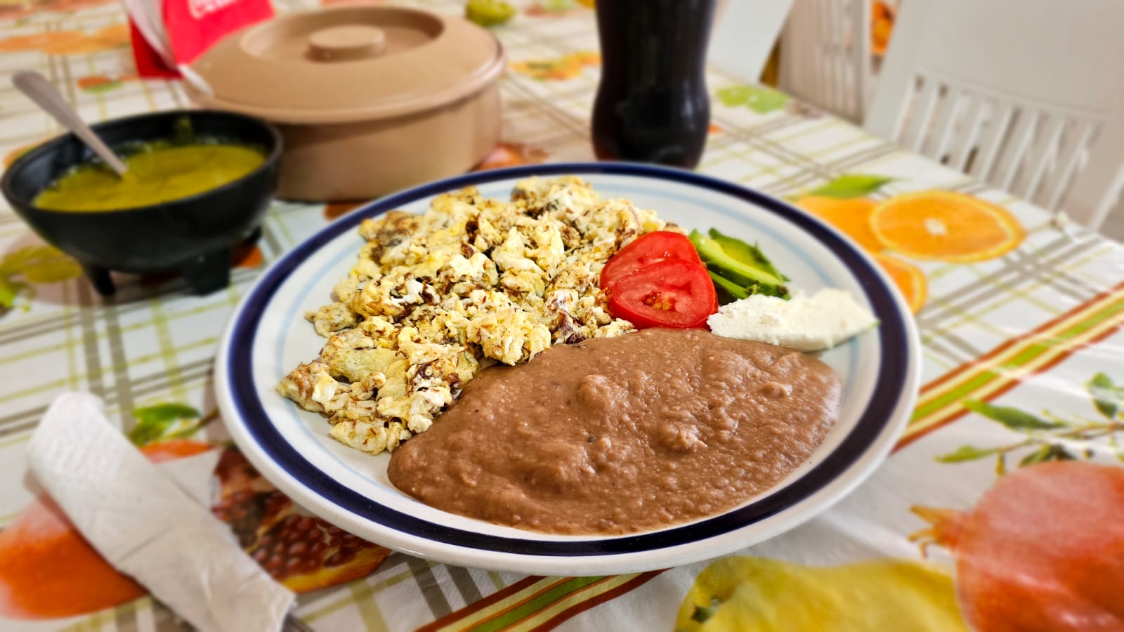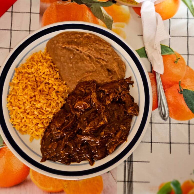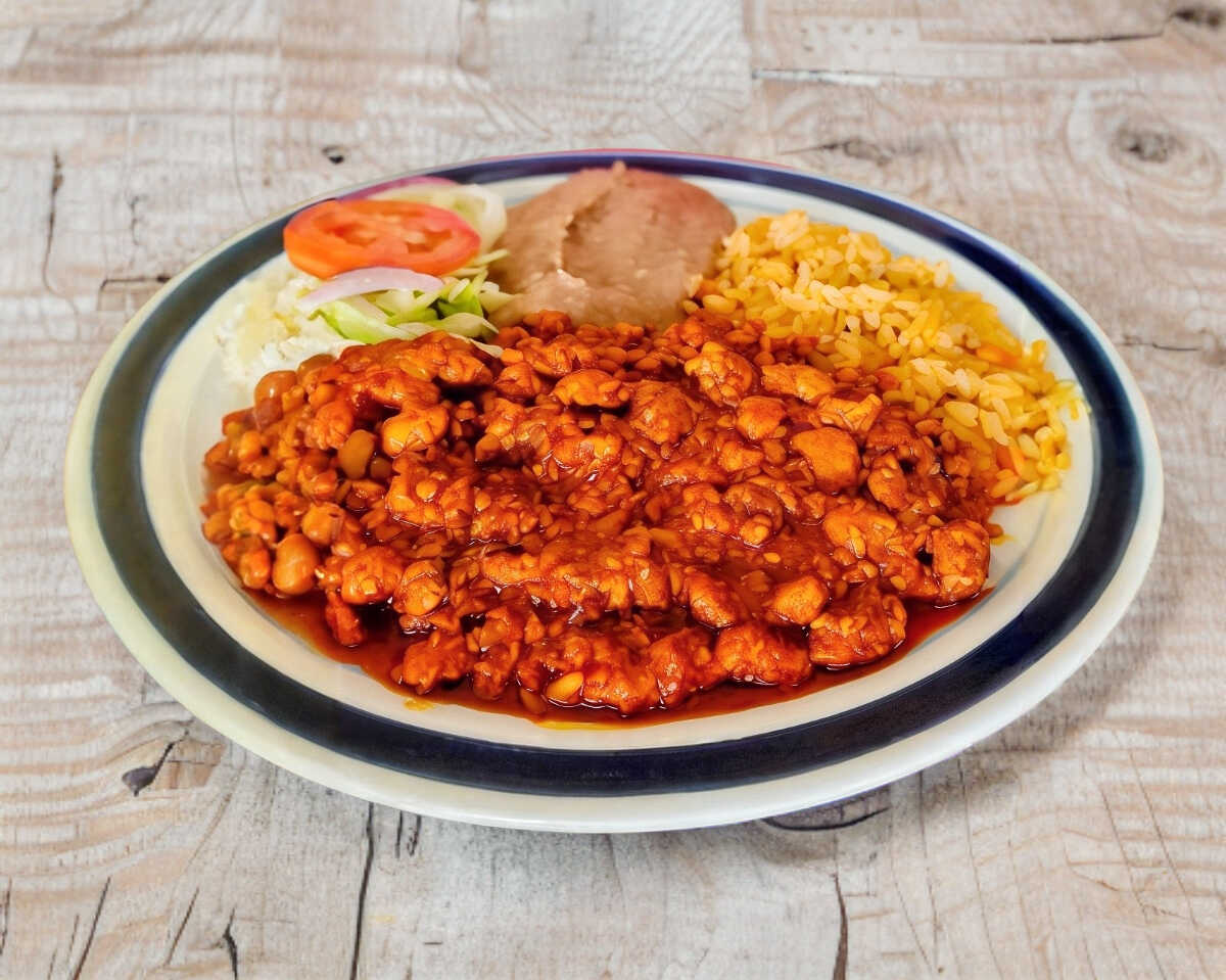 Platillo de mole con arroz frijoles y tortillas