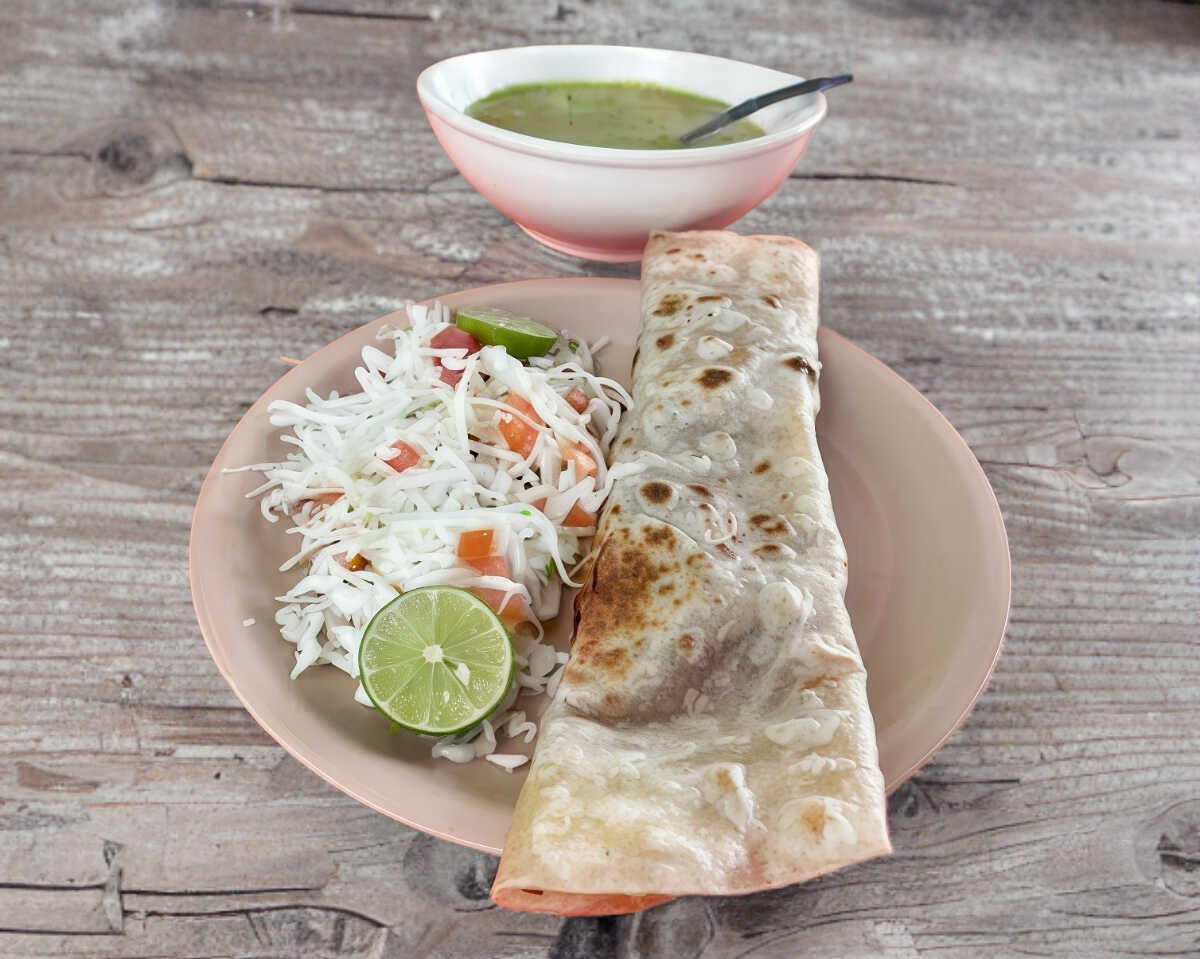 Tortilla de 22 cm rellena de queso asadero acompañado del guiso de tu preferencia