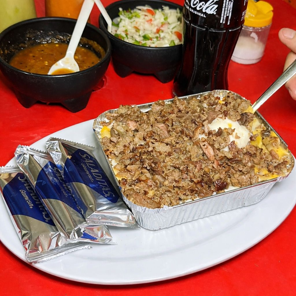 Deliciosa Papa Asada, Con Carne, Sazonada Con Mantequilla, Queso Asadero y Queso Amarillo, Acompañada con Galletas Saladitas