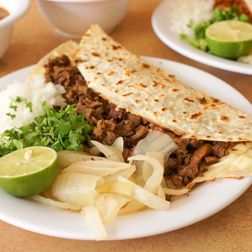 Tortilla de Harina De 35cm Con Carne Asada, Queso Asadero y Aguacate