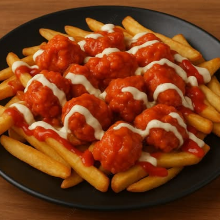 Papas a la francesa con mini boneless en trozos bañados con catsup, mayonesa, ranch y una salsa a elegir.