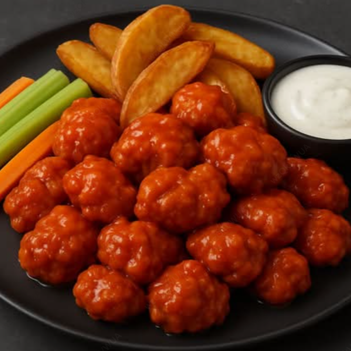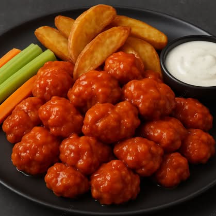 10 Boneless bañados en 1 o 2 salsas, porción de papas gajo, verduras zanahoria y apio y aderezo ranch de la casa.