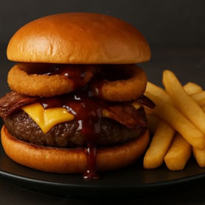 Pan, carne de res, queso amarillo, tocino, aros de cebolla, salsa BBQ y crema de la casa, acompañada de una porción de papas a la francesa.
