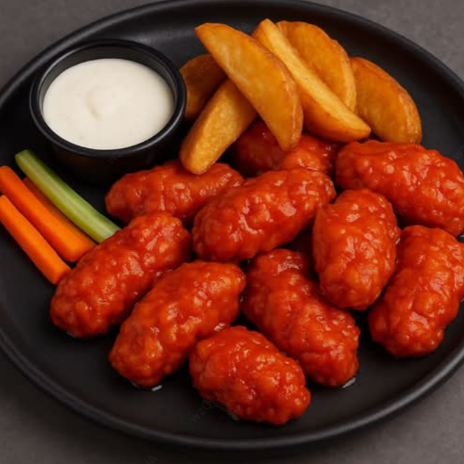 16 Boneless bañados en 1 o 2 salsas, porción de papas gajo, verduras zanahoria y apio y aderezo ranch de la casa.