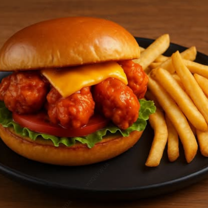 Pan, lechuga, boneless bañados en una salsa, queso amarillo, tomate y crema de la casa, acompañada de una porción de papas a la francesa.