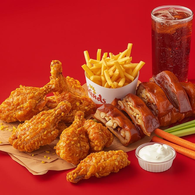 15 boneless con opción de dos salsas a elegir, costillitas de elote (1/2), papas gajo, 2 L de té, zanahoria, apio y ranch.