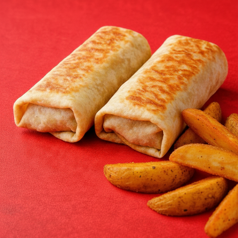 2 Burritos fritos rellenos de pizza calientitos recién hechos acompañados de una orden de papas gajo crujientes y exquisitas para completar ese antojo.