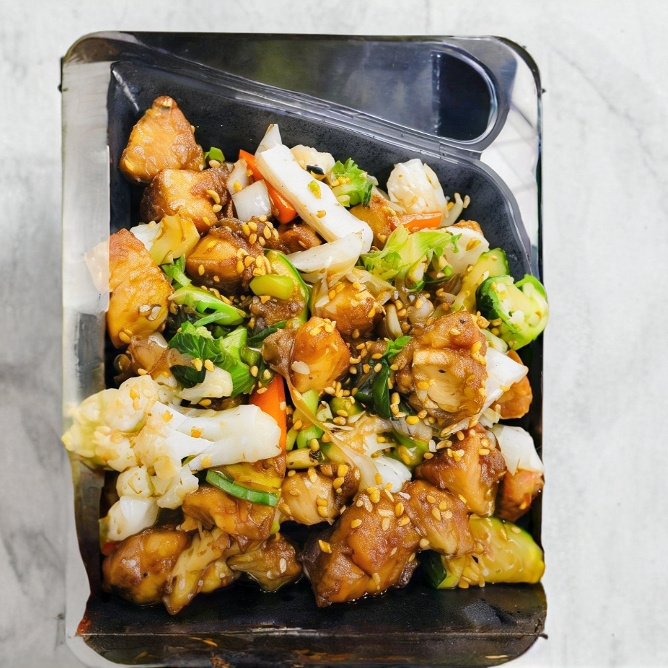 Deliciosos trozos de pollo crujiente salteado con verduras y ajonjolí con la salsa de la casa.