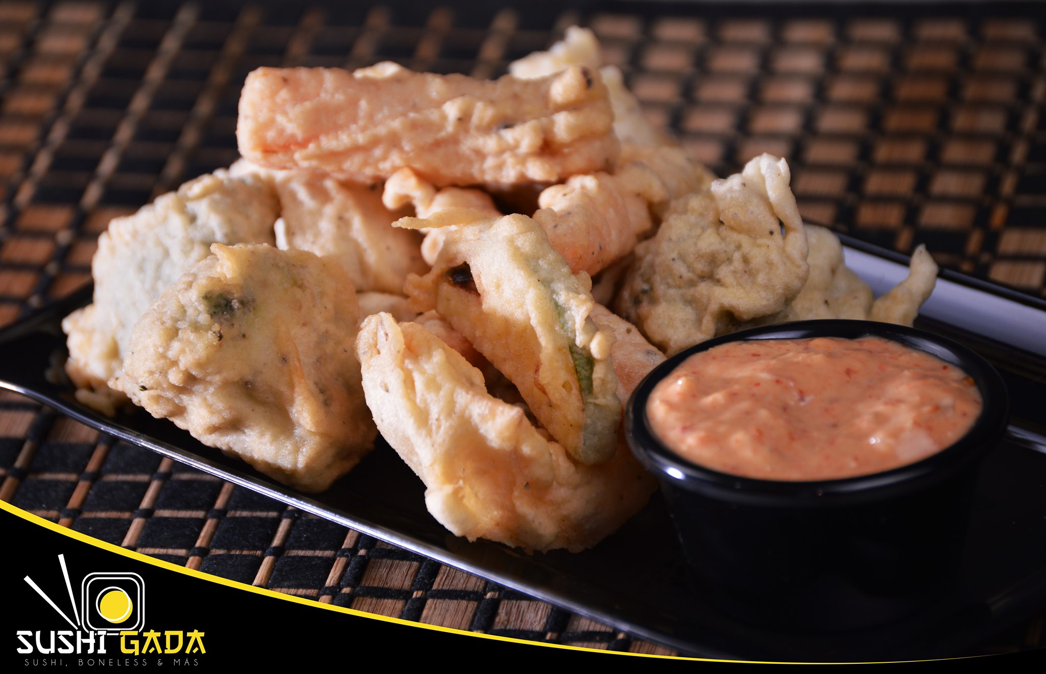 Rellena de surimi o pechuga de pollo, órden de verduras tempura y 1 litro de té.