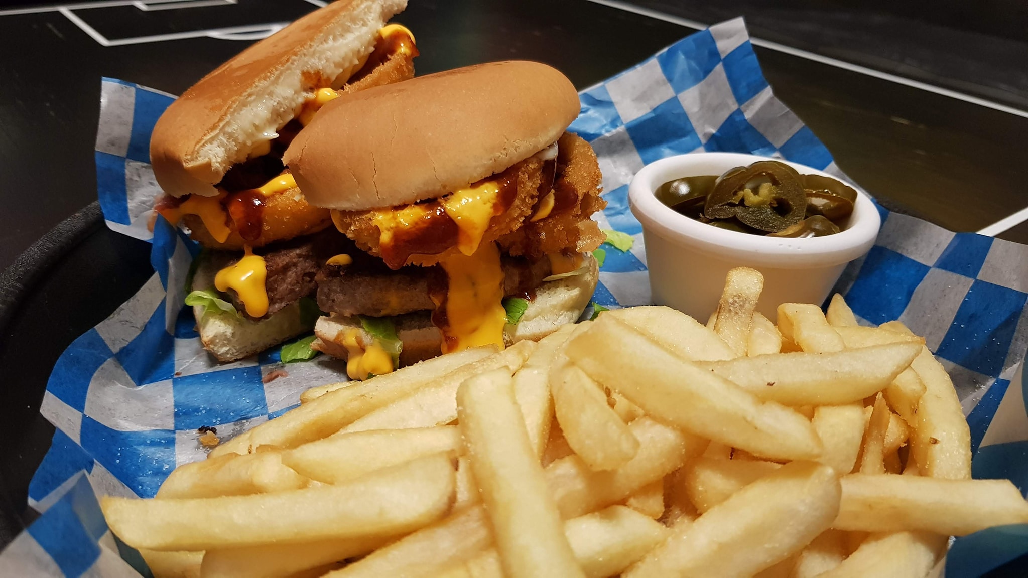 Carne angus de res, queso americano, aros de cebolla, salsa BBQ y tocino. Incluye papas a la francesa.