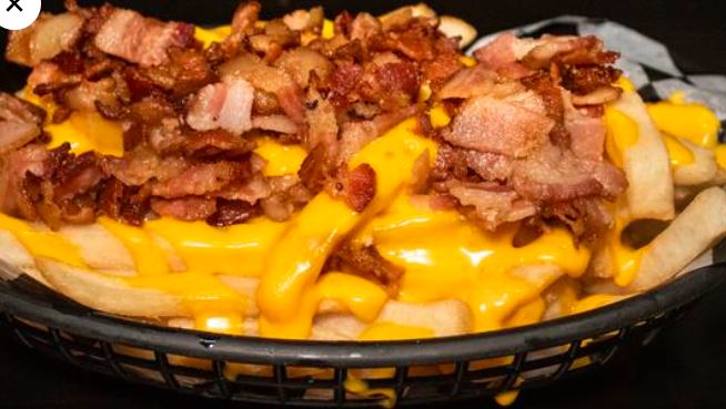 Queso americano y trocitos de tocino. Incluye papas a la francesa.