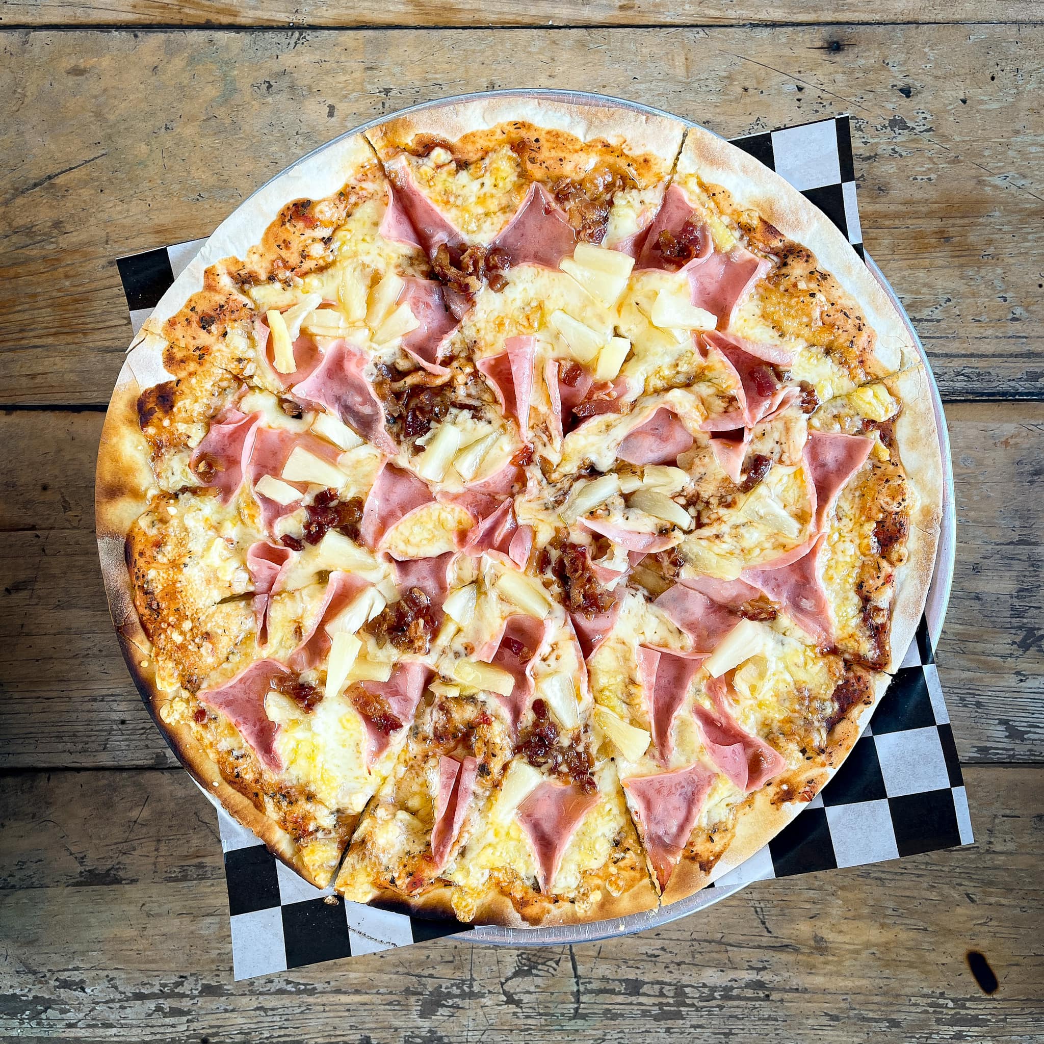 Jamón, piña y tocino.