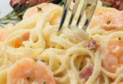 Spaghetti carbonara con camarón