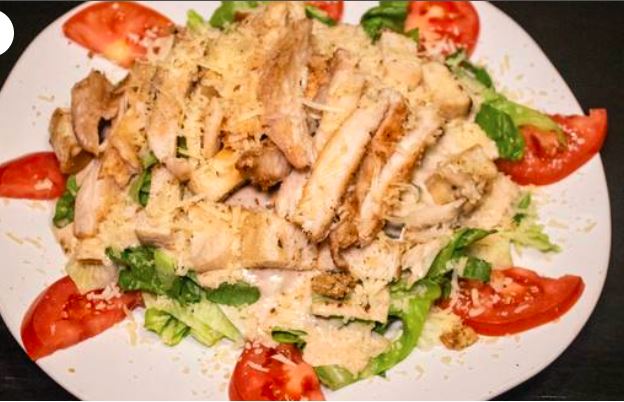 Mezcla de lechuga ramona, orejona, crotones echos en casa, parmesano fresco, aderezo César del chef y tiras de pechuga de pollo a la plancha.