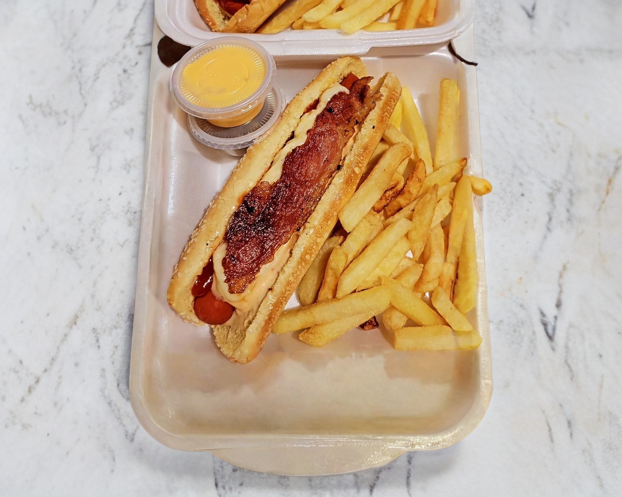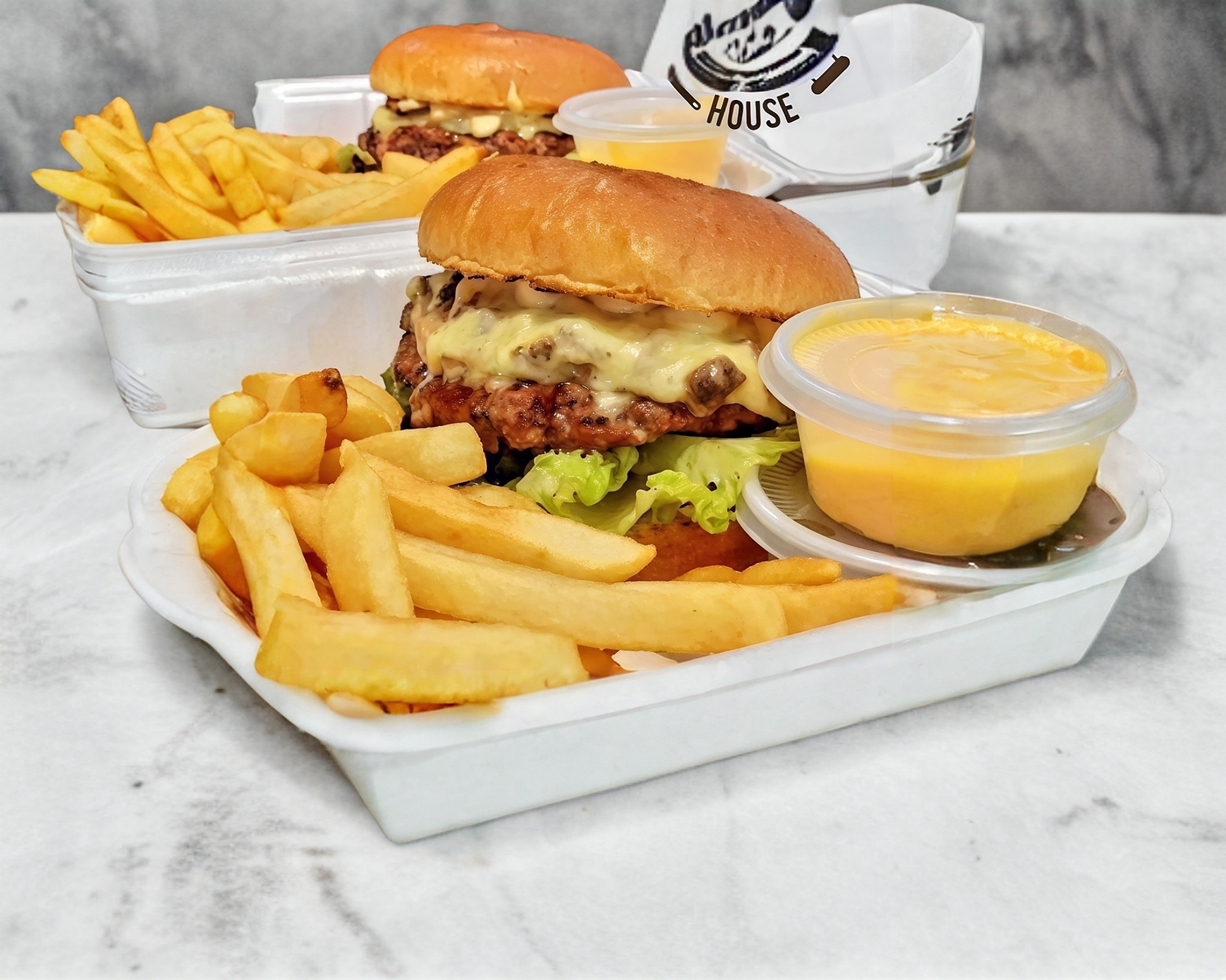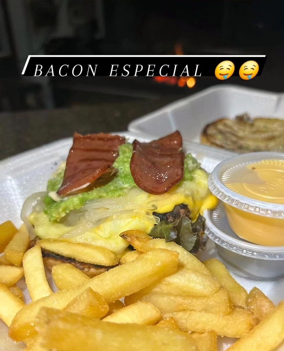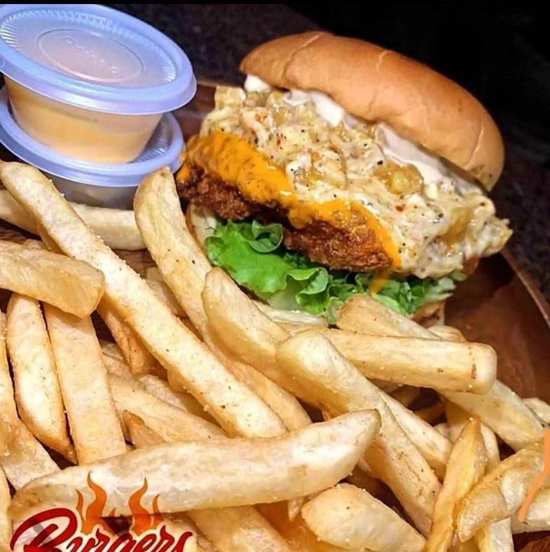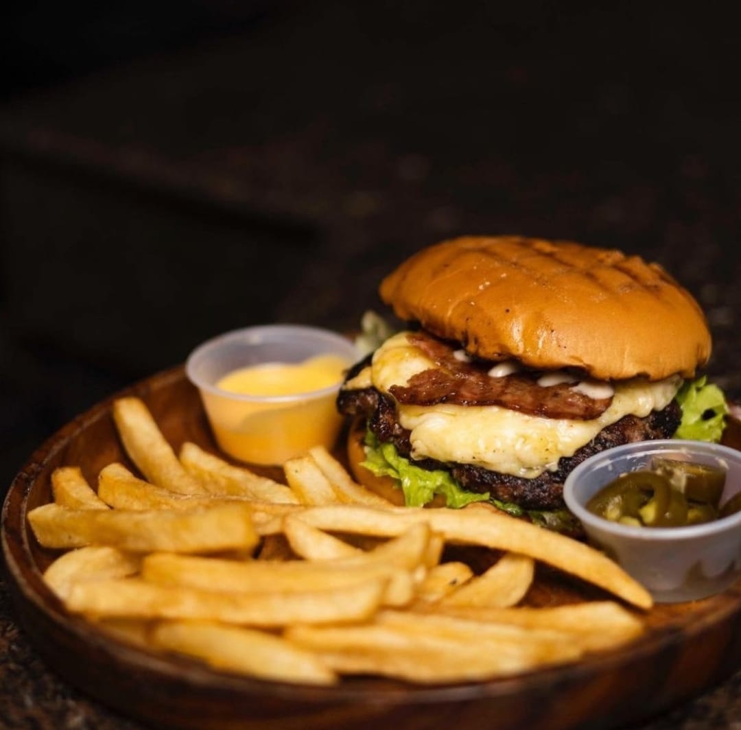 Mezcla de quesos fundidos con tocino,lechuga y aderezo. Además elaborada con pan brioche, acompañada de papas a la francesa, porción de chiles jalapeños por separado y queso amarillo liquido.