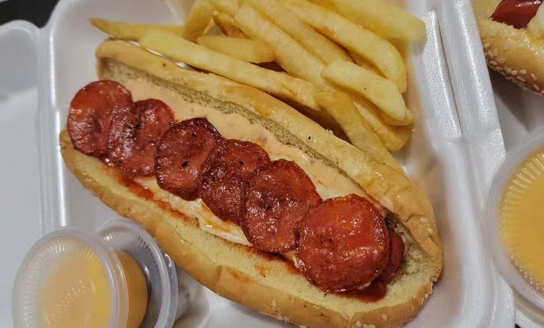 Mezcla de quesos fundidos con pepperoni, queso de cabra, lechuga y aderezo. Además elaborada con pan brioche, acompañada de papas a la francesa, porción de chiles jalapeños por separado y queso amarillo liquido.