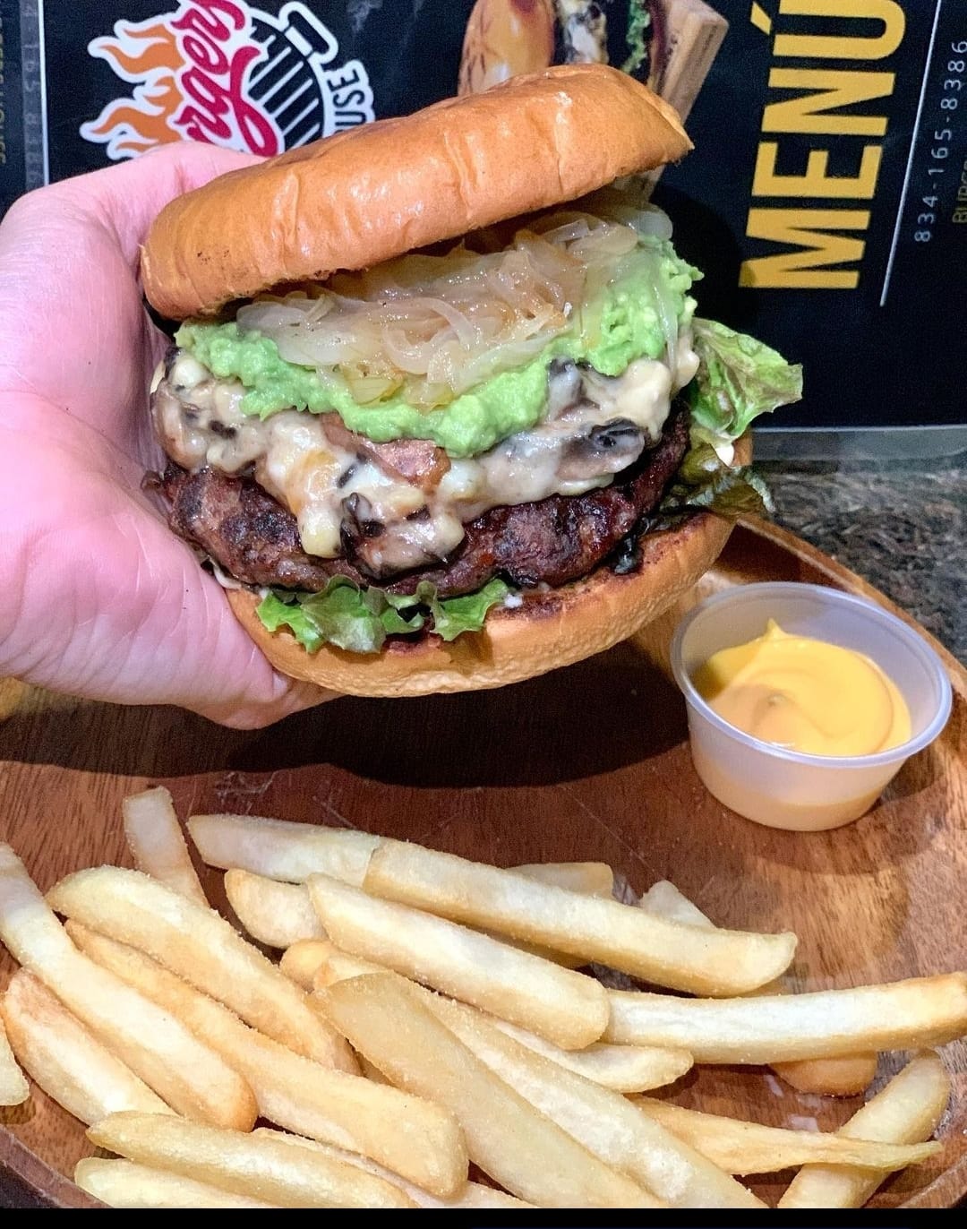 Queso fundido, queso cheddar, guacamole, cebolla caramelizada, tocino y aderezo. Además elaborada con pan brioche, acompañada de papas a la francesa, porción de chiles jalapeños por separado y queso amarillo liquido.