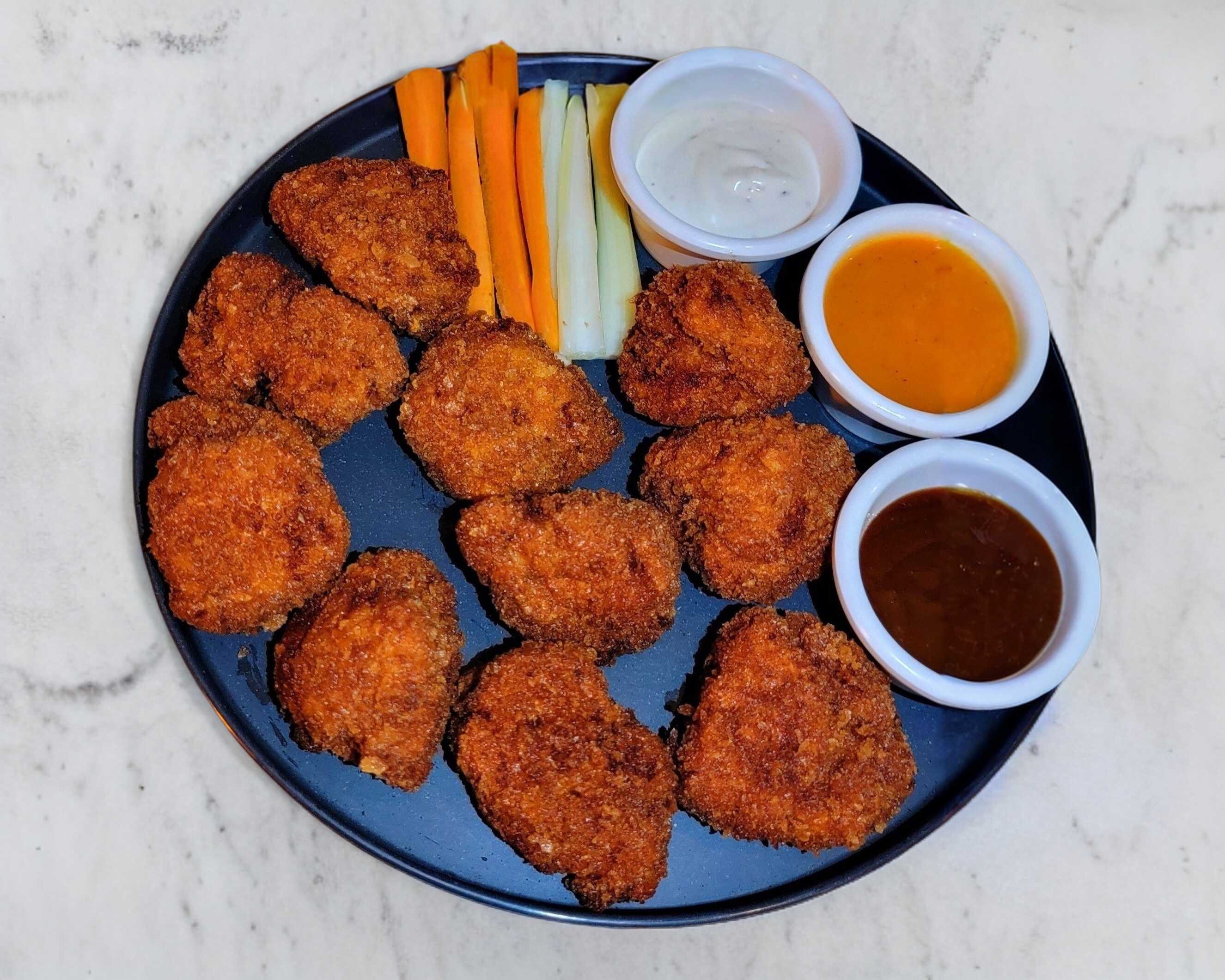 Boneless recién salidos, acompañados con ranch, apio y zanahoria y un riquísimo té helado