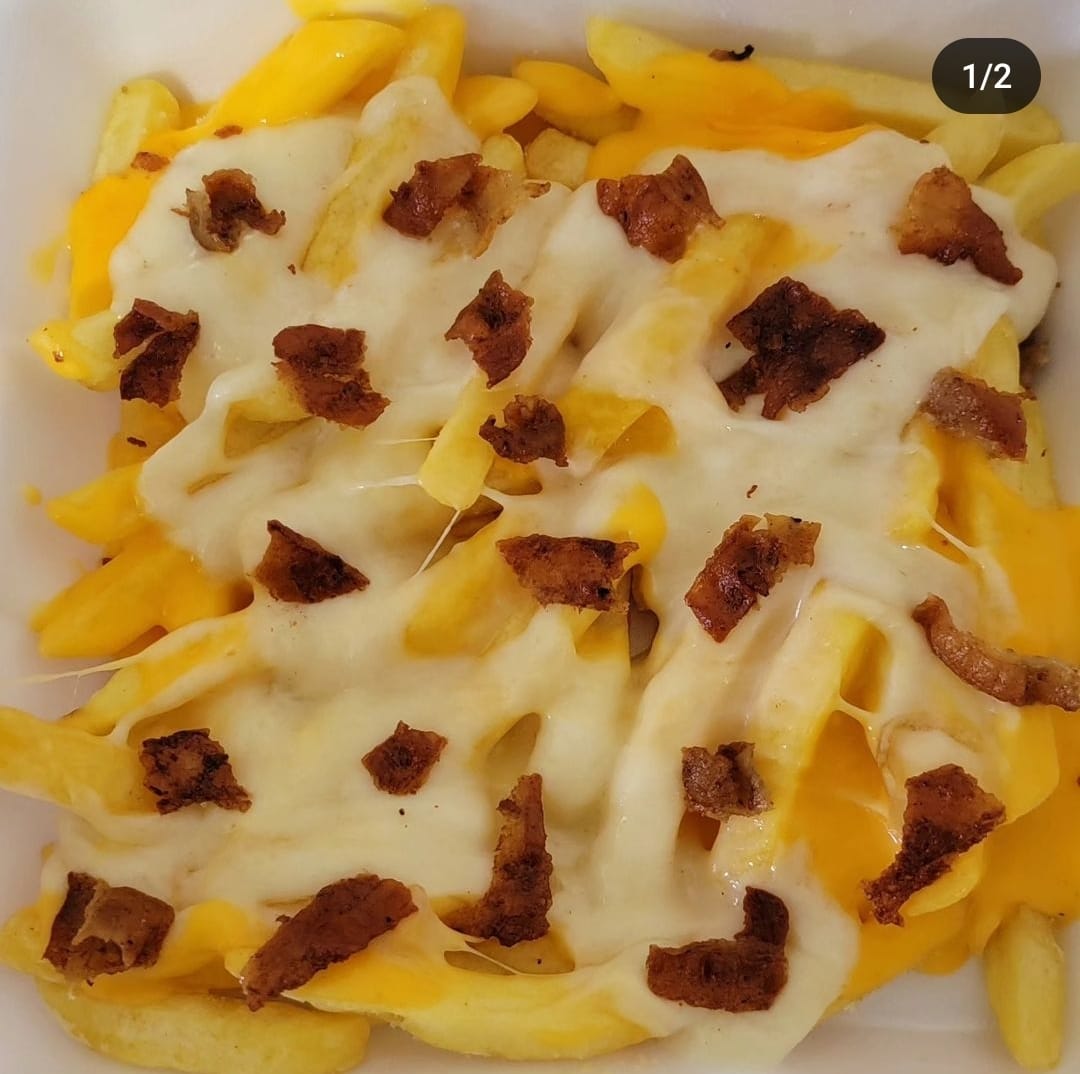 Bañadas en queso fundido, amarillo, tocino y aderezo chipotle.