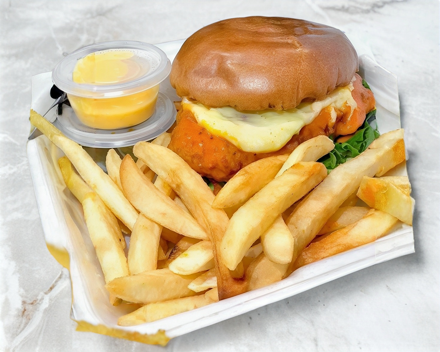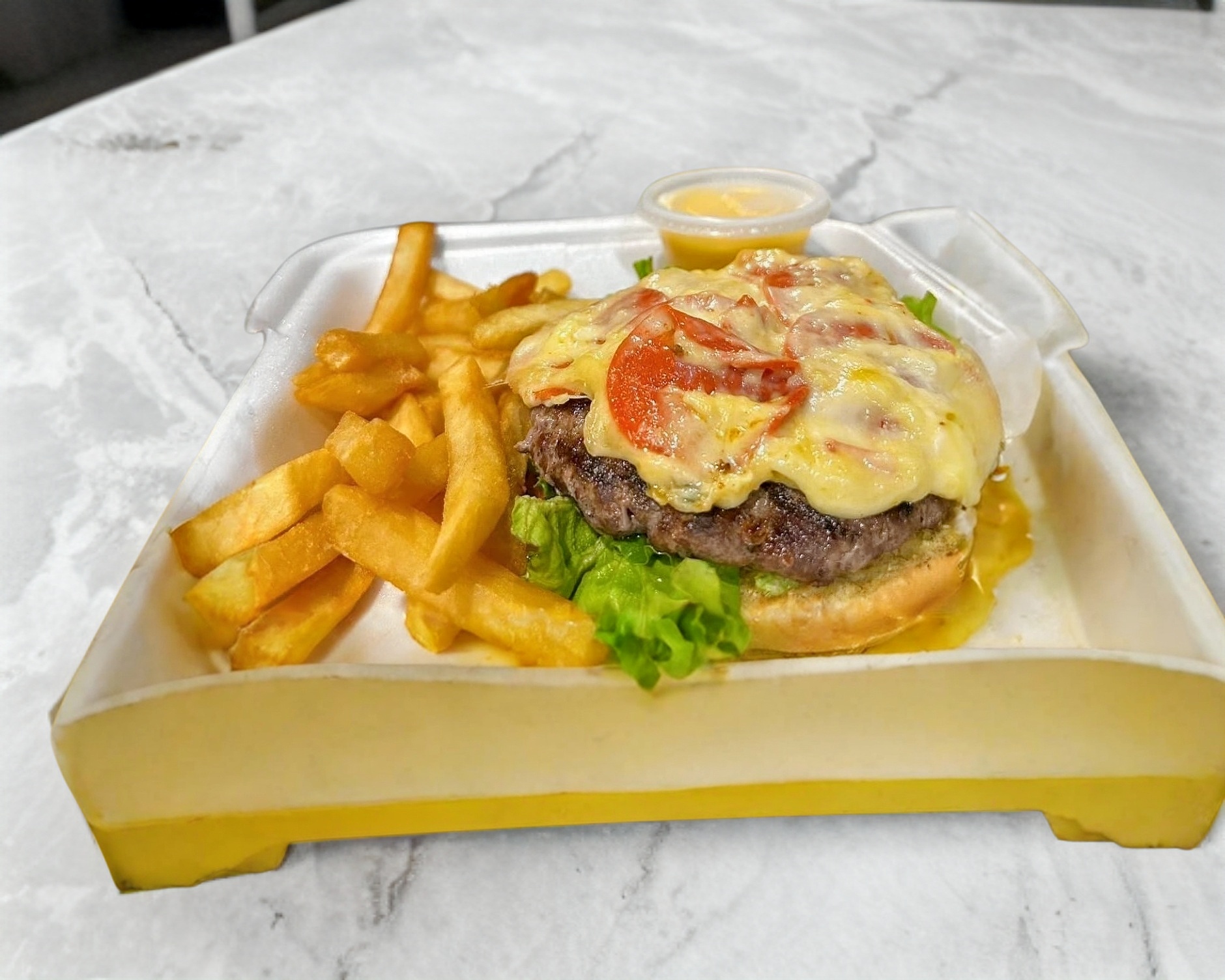 Mezcla de quesos fundidos, lechuga y aderezo. Además elaborada con pan brioche, acompañada de papas a la francesa, porción de chiles jalapeños por separado y queso amarillo liquido.