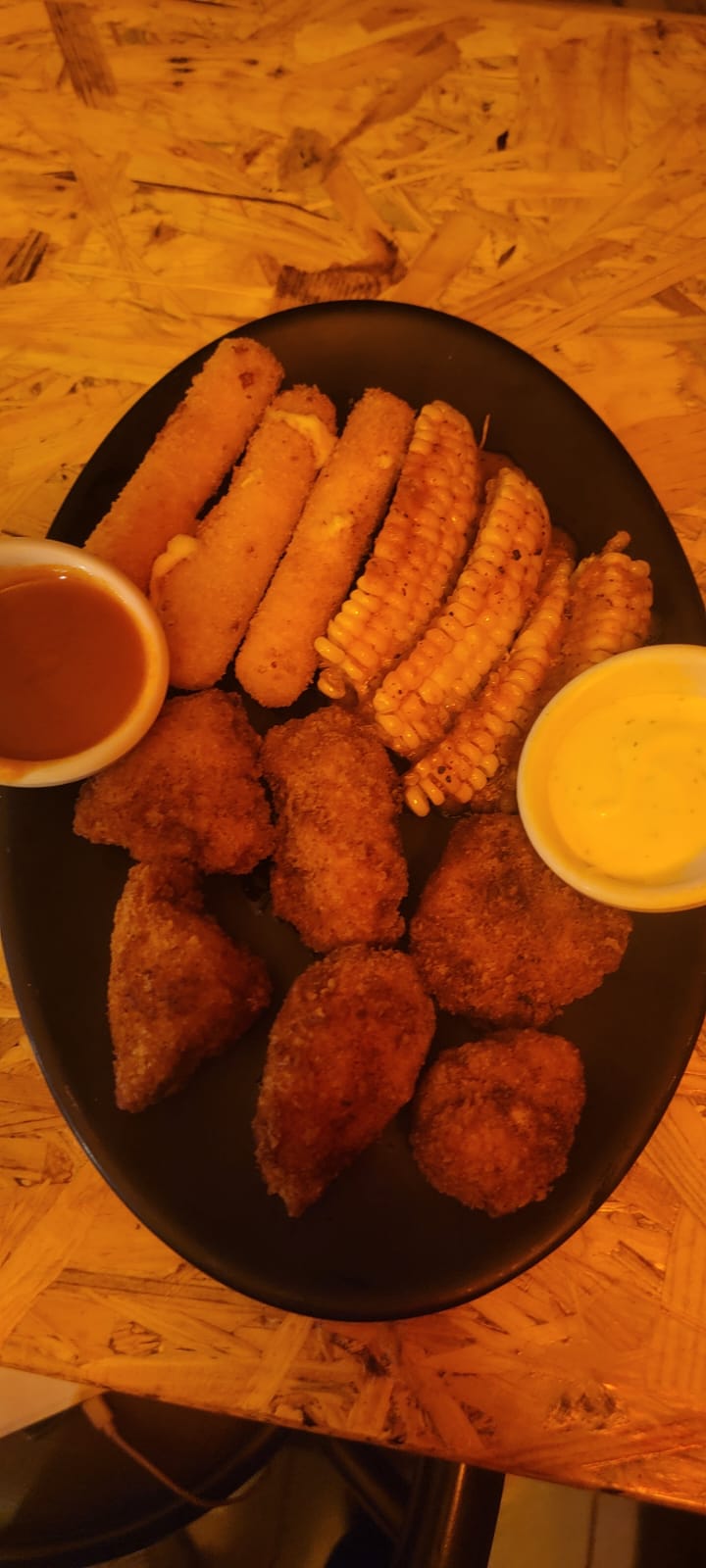 Charola con 6pz de boneless, 4 costillas de elote, 3 dedos de queso y 1 litro de té helado.