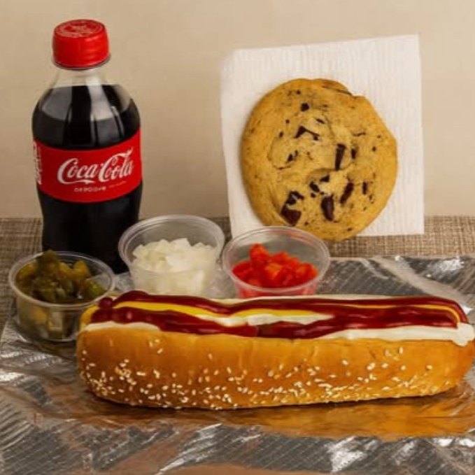 Hot dog de 20 cm, con salchicha de carne de res jugosa (de costco) en pan jumbo suave, con aderezos como mostaza, mayonesa, kétchup, acompañado de tomate, cebolla y chile. Incluye 1 Coca-Cola de 350 ml y 1 galleta con chispas de chocolate.