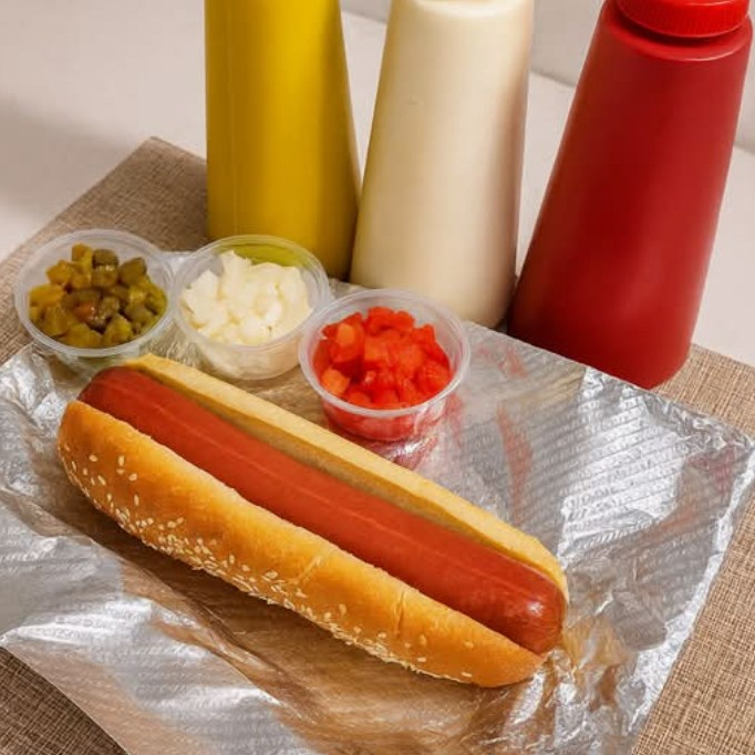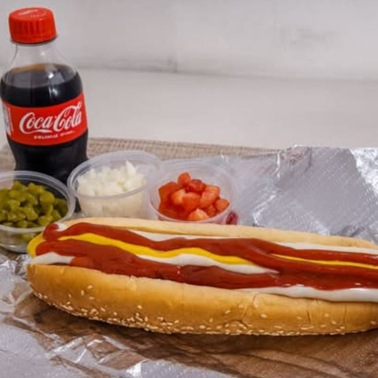 Hot dog de 20 cm, con salchicha de carne de res jugosa (de Costco), en pan jumbo suave, con aderezos como mostaza, mayonesa y ketchup, acompañado de tomate, cebolla y chile. Incluye una coca-cola de 350 mL.