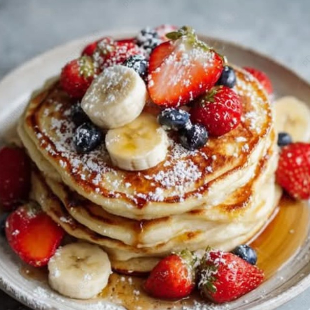 3 pzas de Hotcakes con Mantequilla🧈, con mix de fruta de temporada (Fresas, Blueberries, Plátano, etc..) y miel de maple 🍯
