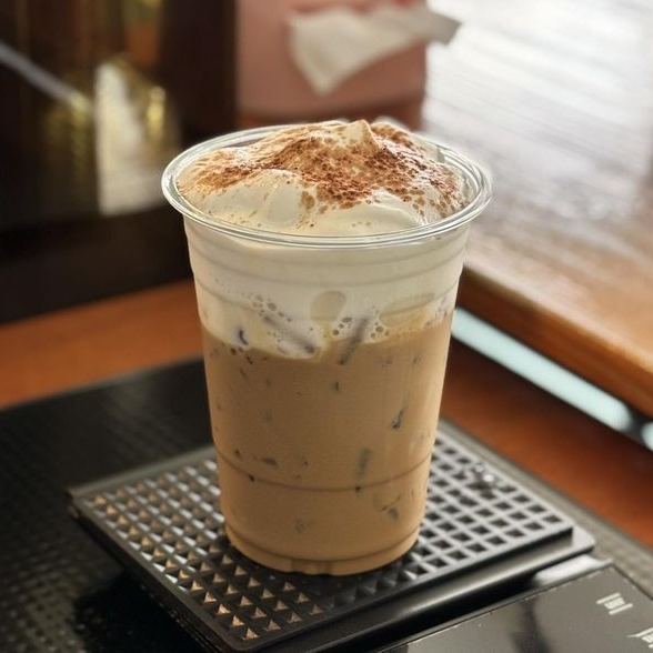 Iced Cappuccino (Grande 16 oz-473 ml) con Espresso doble, leche, hielos y vainilla de la casa, canela y/o cocoa