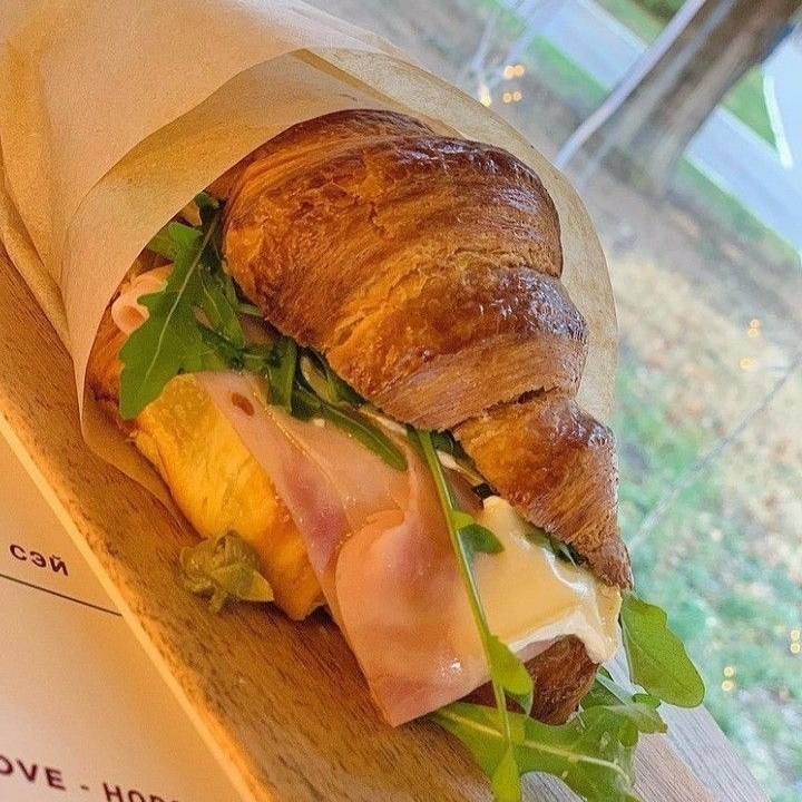 Croissant de mantequilla relleno de jamón de pavo, queso americano, lechuga y tomate