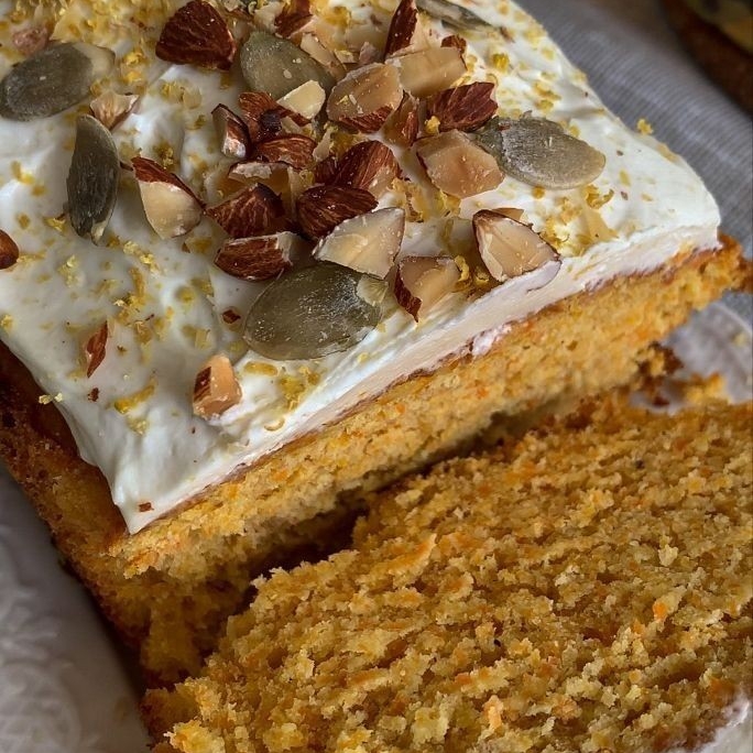 Panque de Zanahoria recién horneado, con betún de queso crema, nueces y frutos secos