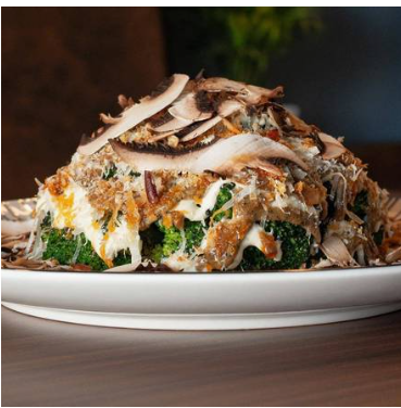 Brócoli asado, aderezo de parmesano, aderezo de guajillo tatemado, crumble de pan, láminas de champiñón, nuez tostada, queso parmesano y macha de morita.