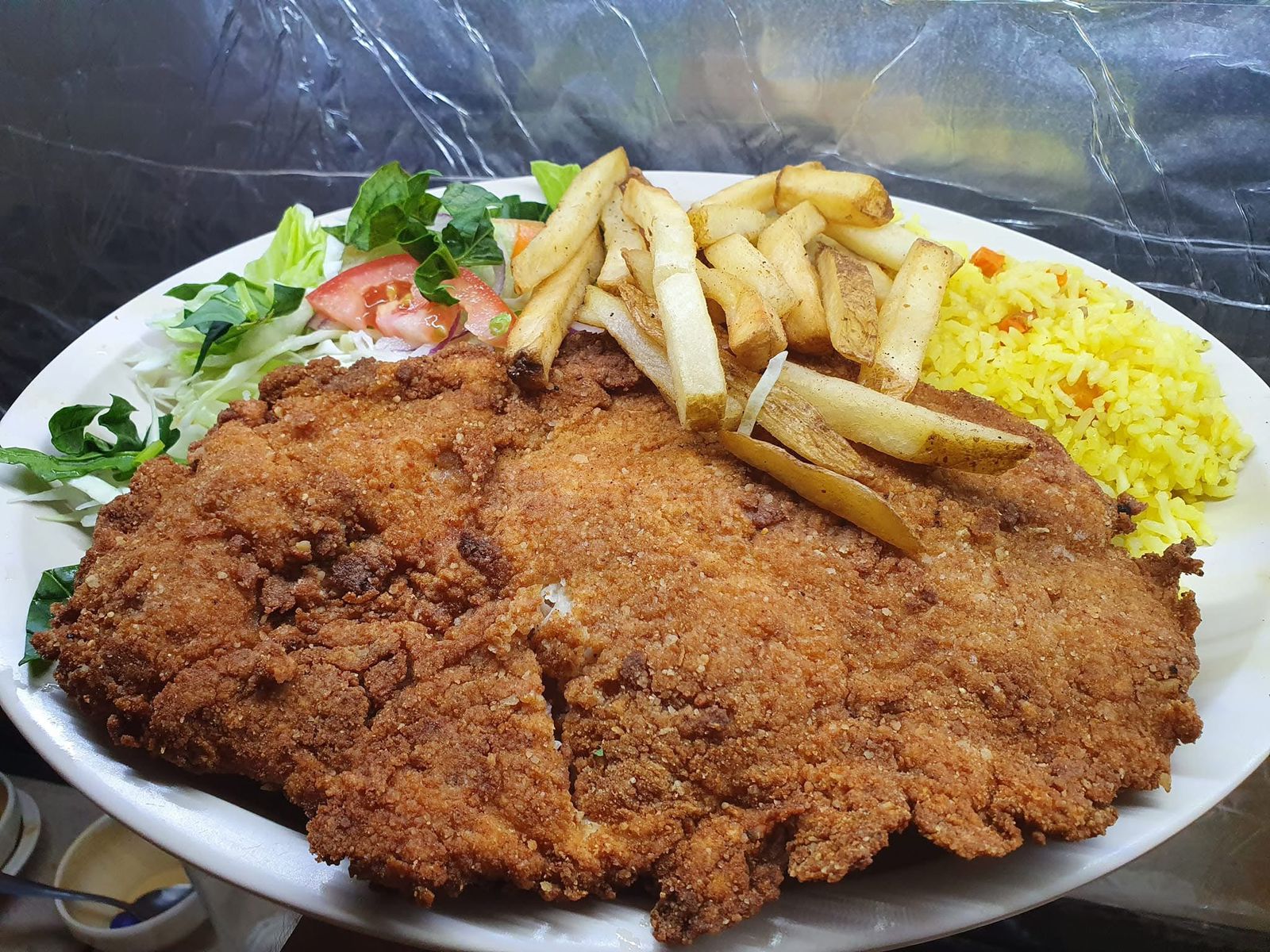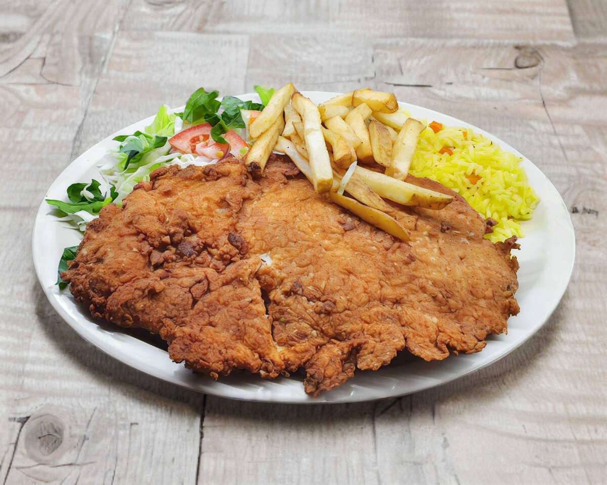 Relleno de queso y jamón, acompañado de arroz, papas y ensalada.