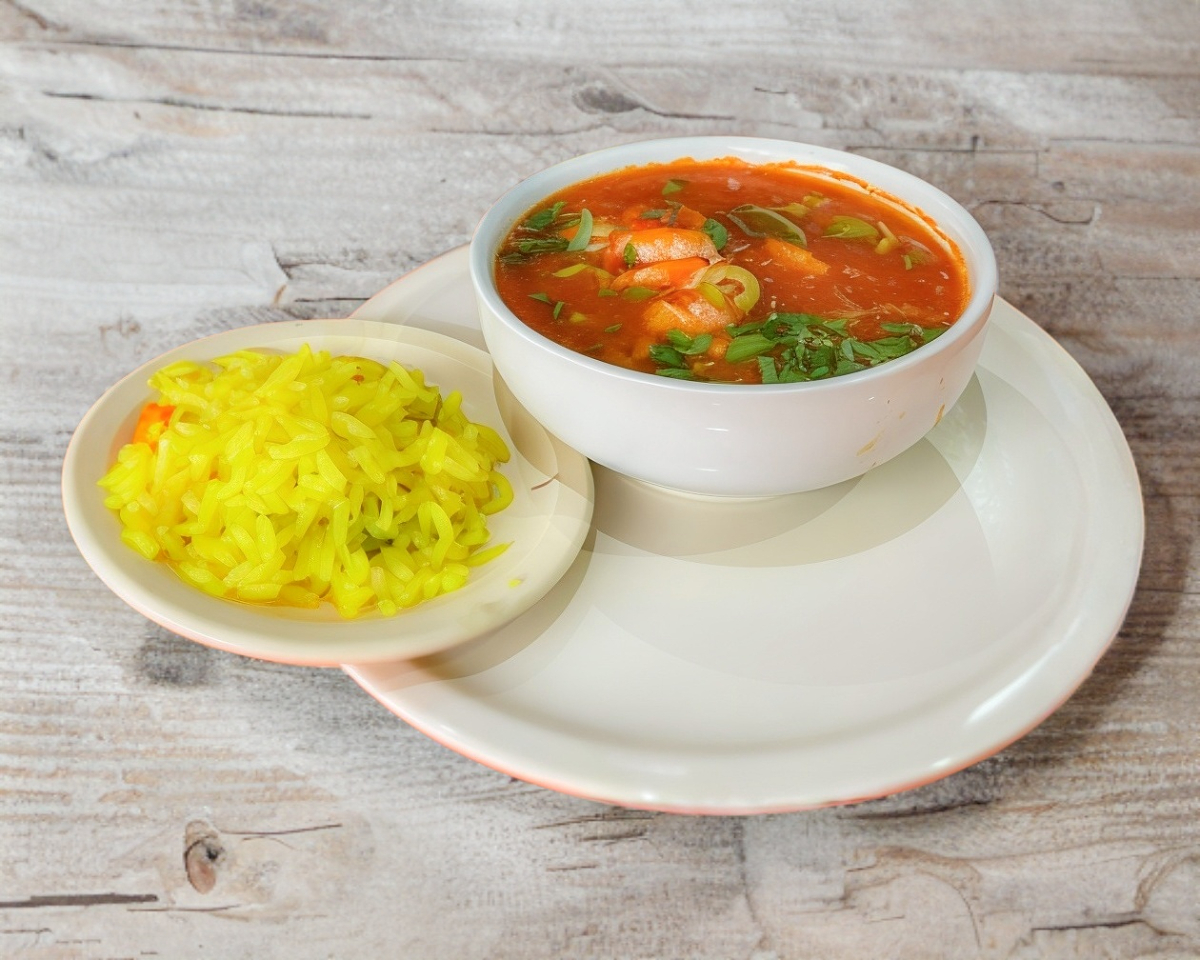 Filete cocido al vapor con verduras, tomate, cebolla, mariscos, calamar, ostión y camarón, gratinado con queso y acompañada de arroz.