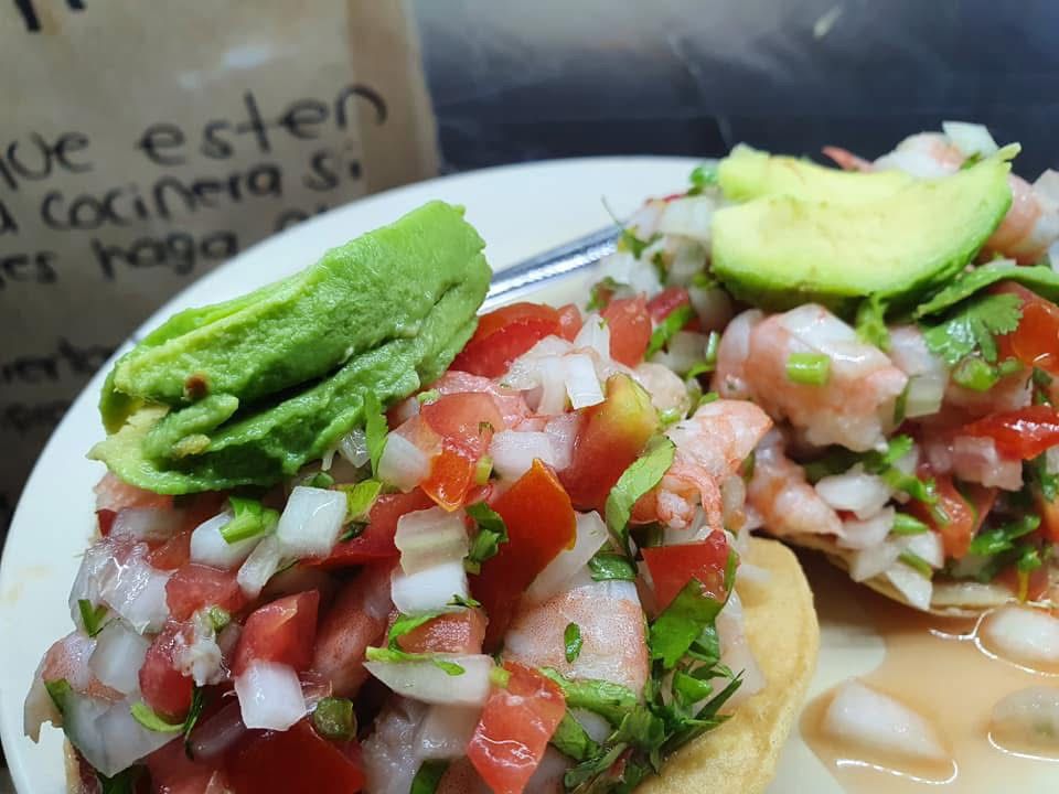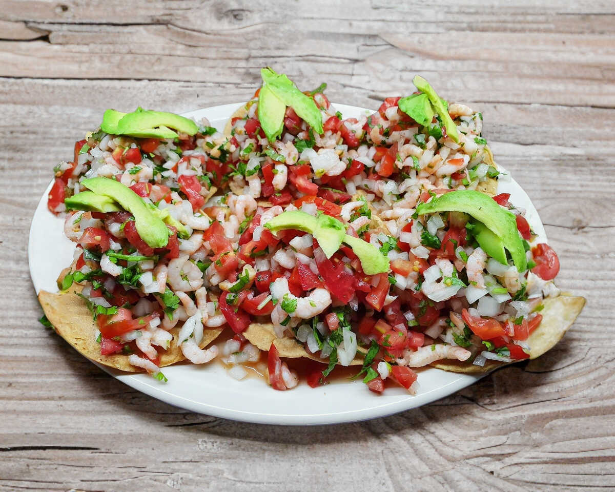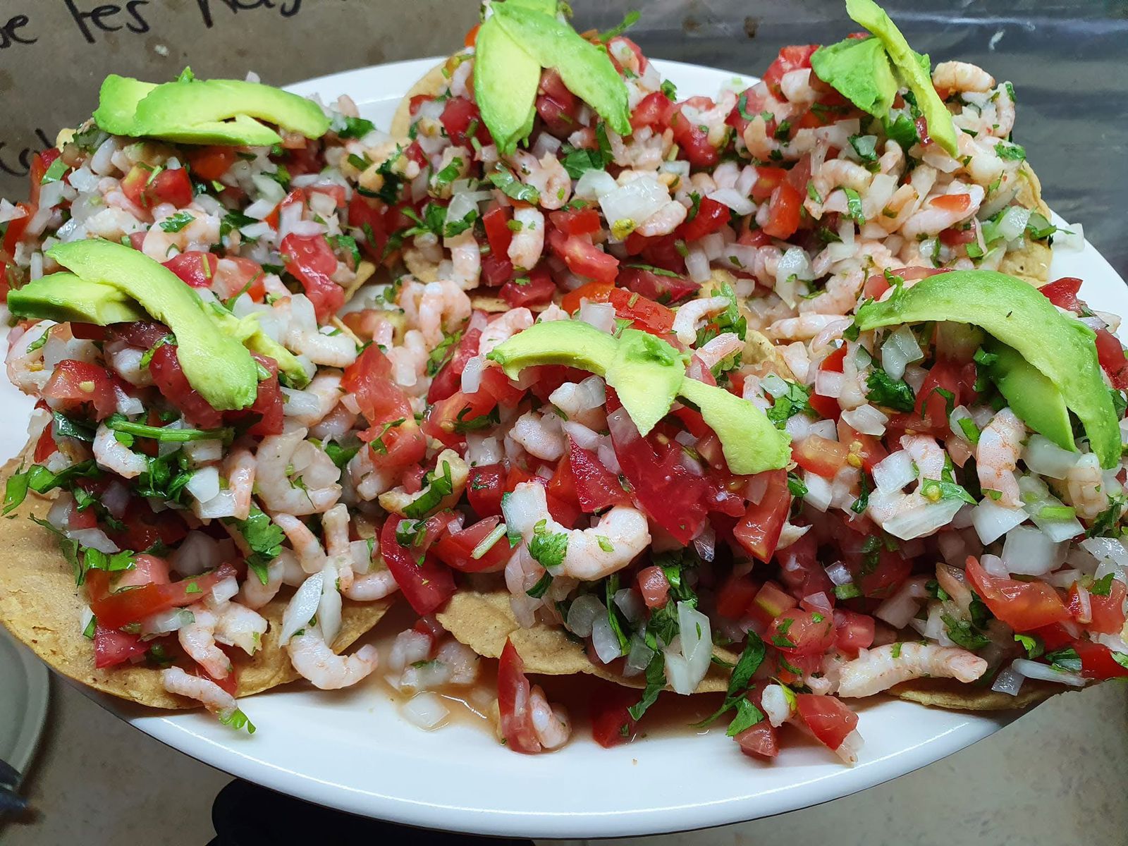 Camarones frescos, mezclados con aderezo ranch y ensalada de verduras en una cama de lechuga, tomate y aguacate.