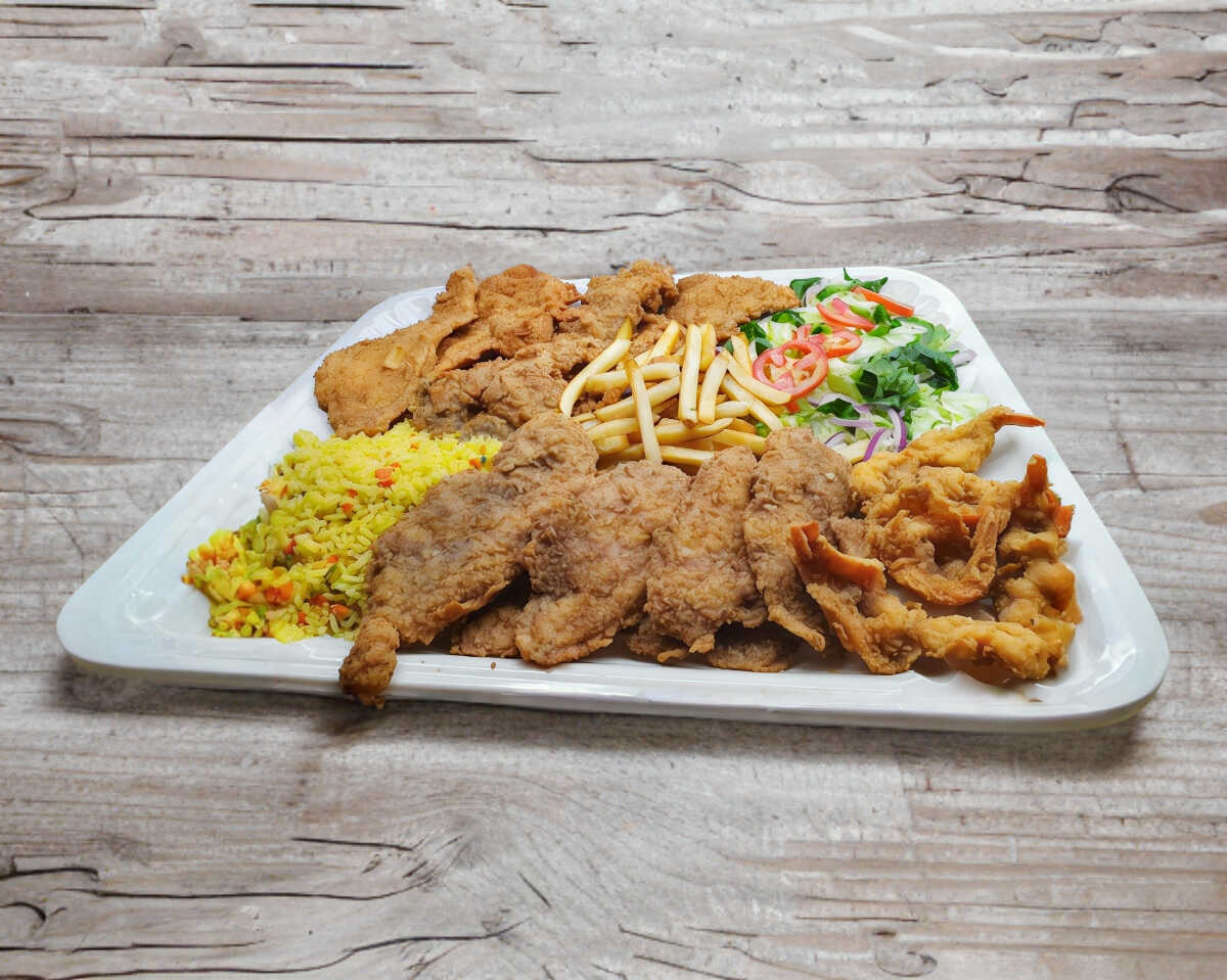 Filete empanizado, sopa de mariscos en recipiente de 500ml ch más coctel de camarón ch