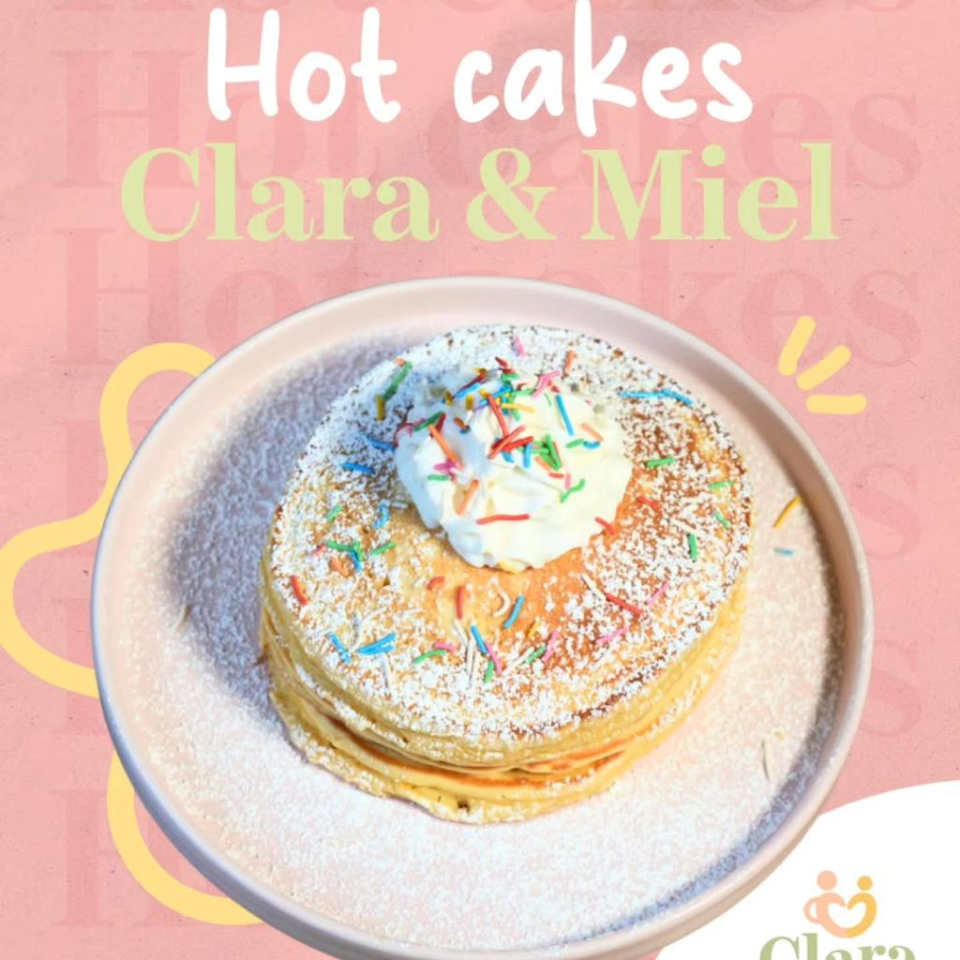 HOT CAKES HECHOS CON LA RECETA DE LA CASA, ESPOLVOREADOS CON AZÚCAR GLASS, ADORNADOS CON DELICIOSAS CHISPAS DE COLORES Y CREMA BATIDA