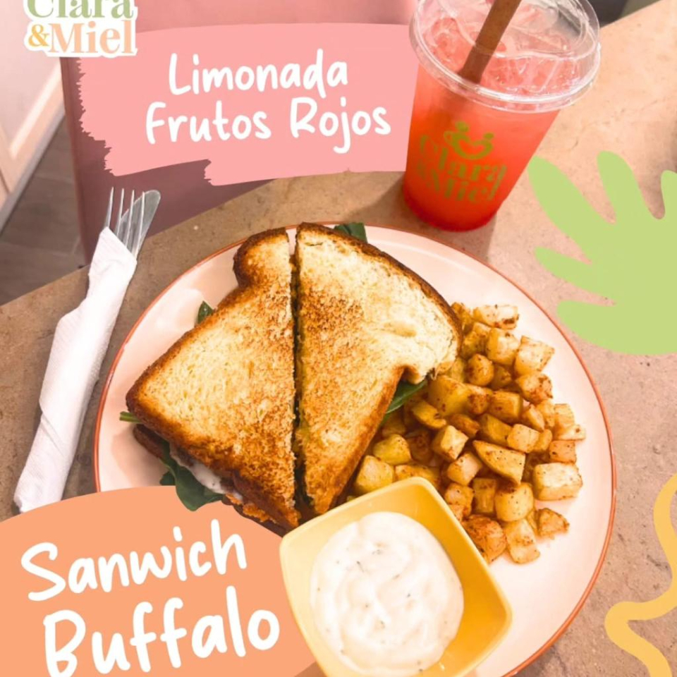 PAN BRIOCHE LIGERAMENTE TOSTADO, CON POLLO, QUESO OAXACA, SALSA BUFFALO, MIX DE HOJAS VERDES, ACOMPAÑADO DE PAPAS Y RANCH.