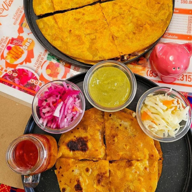 Frijol, queso y 1 guiso a elegir mole, salsa verde o chicharrón.