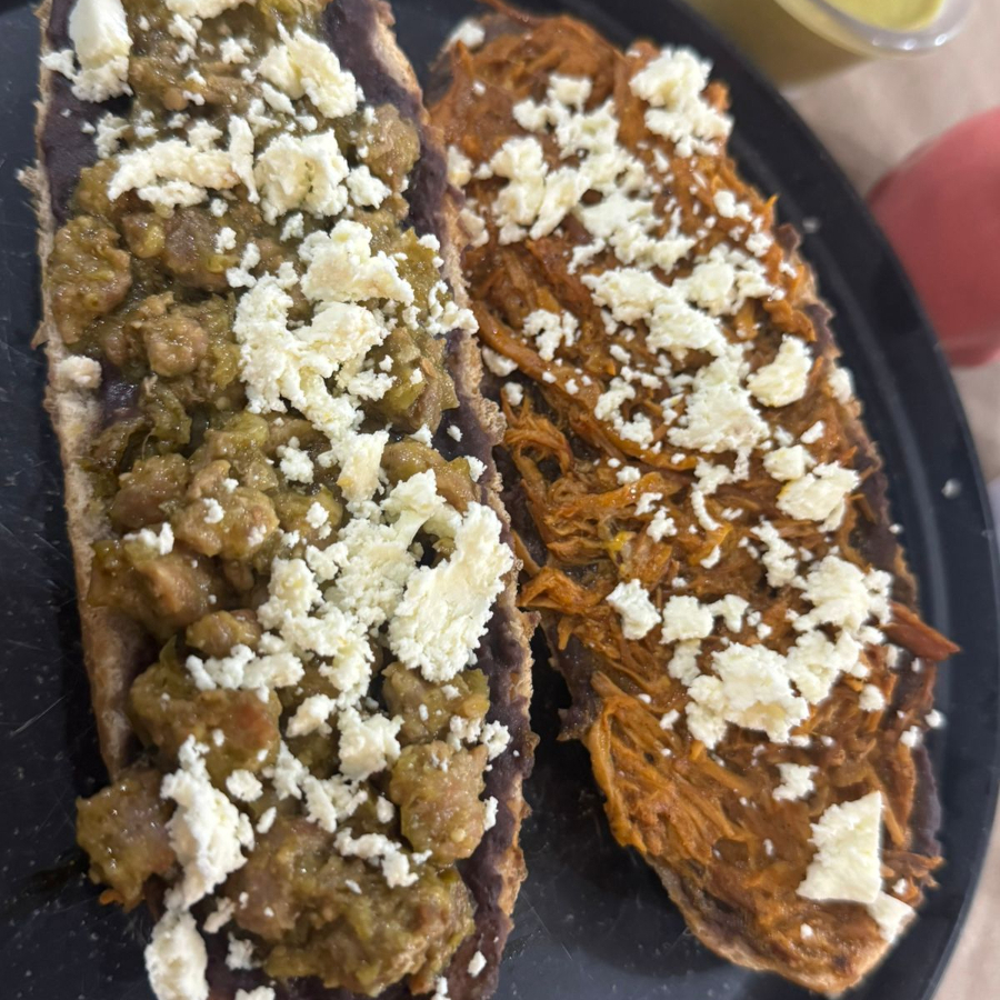 Frijol negro, queso y 1 guiso a elegir mole, salsa verde o chicharrón.